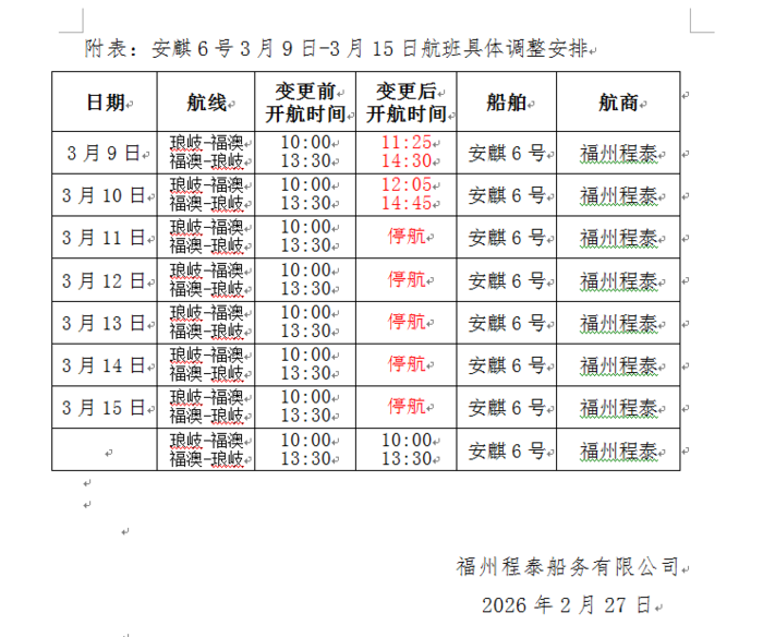 琅岐航線(安麒6號)3/9-3/15航班異動