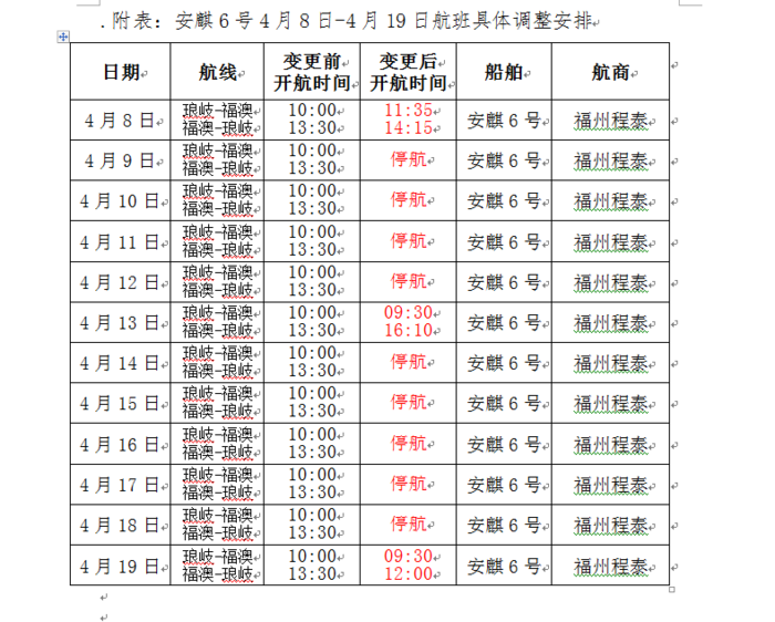 琅岐航線(安麒6號)4/8-4/19航班異動