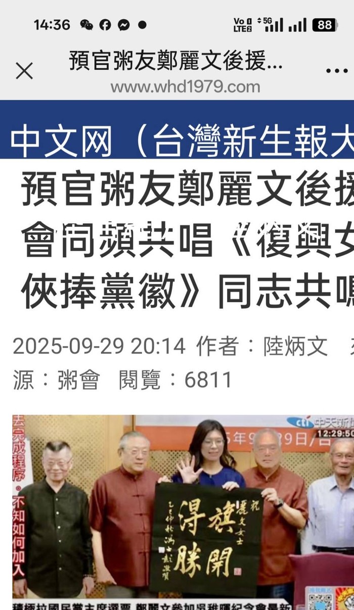 只有鄭麗文可以做全職的國民黨黨主席! --閱讀人次 : 1895 預官粥友會,全球粥友總會會長陸炳文,陸軍上將季麟連,前警政署長王進旺,京劇名角朱明月教授”””等近20人,9/29宴請鄭麗文,並表示全力支持她,高票當選國民黨黨主席,拯救國民黨於存亡之秋,帶領國民黨,打敗貪污腐敗,又無能惡極的民進黨,解救台灣人民於倒懸,朗朗青天再現,中華民國萬歲!