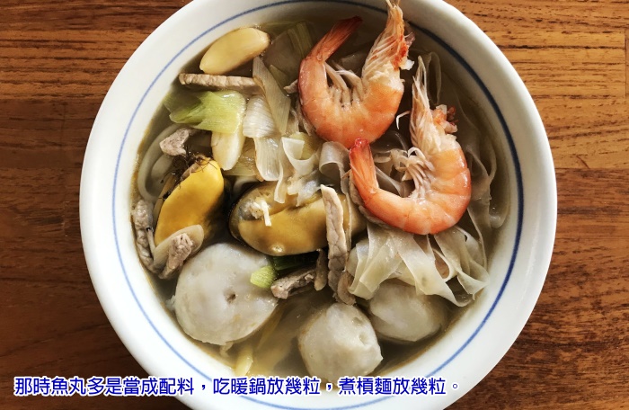那時魚丸多是當成配菜食用,吃暖鍋(火鍋) 放幾粒,煮槓麵放幾粒,很少像現在這麼豪邁,純吃魚丸湯。只有在祭拜神明、祖先的供桌上,恭恭敬敬獻上一碗純魚丸,上面貼一片紅紙討吉祥,似乎也在警告小孩,不可偷食。