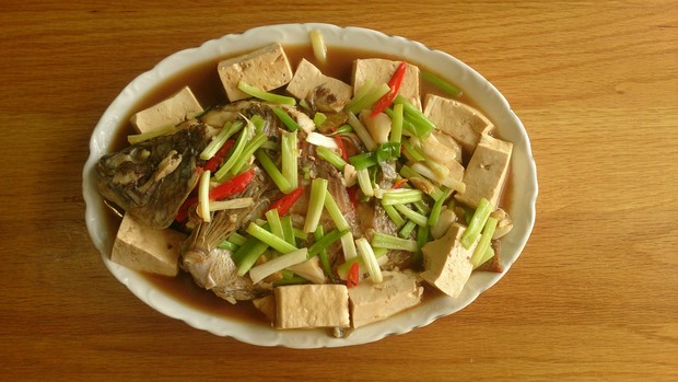 我之所以敢推薦豆腐燒魚給大家,是因為吃過的人都說好吃。民國68年,中山國中數學科蔡老師約我到金山露營,當天我負責煮兩道菜,這一道吃得「屍骨無存」。69年暑假我在師大進修,黃昏時在校園裡巧遇樂國和雨秋。承蒙雨秋兄熱誠的邀請,咱們三人就去新北投柳府用餐。柳夫人還未下班,我「順理成章」的接管廚房,不記得煮了哪些菜,唯一記得的就是豆腐燒魚。因為下班回來的柳夫人,她用饅頭霑魚汁,吃得津津有味,令我印象極為深刻。我煮魚不習慣用料酒,但很注意用蔥、辣椒和砂糖。煮這道菜沒啥技巧,成功率很高,大家不妨試試。切記,要買黑色的吳郭魚來煮。