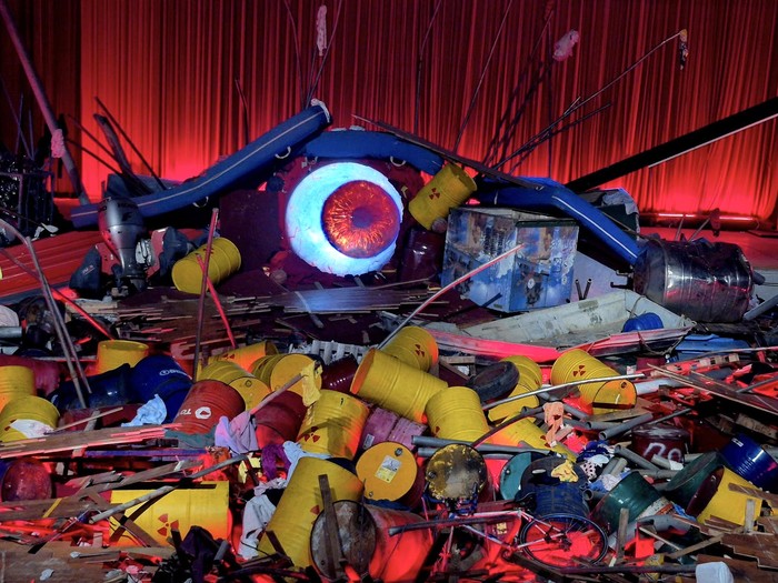 核塵之眼 電影裡,核輻射變異而成的怪獸哥吉拉,靈動的大眼在廢棄體育館正中心翻轉,圓潤眼球循環播放原子彈與氫彈爆炸時升起的蘑菇雲,以及太平洋核試影像,爆炸的轟鳴聲在空曠的展場迴盪。 地板炸裂,暗紅色光線滲出,整個空間暴露在看不見摸不着的核塵...