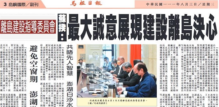 南北竿大橋胎死腹中? --閱讀人次 : 2657 今日馬報三版頭條大篇幅報導:「離島建設指導委員會-蘇揆:最大誠意展現建設離島決心」,報導指出,行政院長蘇貞昌在主持離島建設指導委員會第17次會議時宣示,政府將以最大誠意展現建設離島決心,並已逐步完成各項建設。蘇貞昌在會中細數核定補助連江縣新建「新台馬輪」、加碼澎湖縣「台澎輪」經費,更以百億經費興建「金門大橋」即將完工!