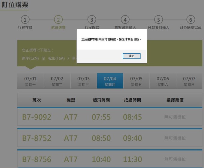 經本站連結立榮航空公司網站,搜尋機位,確實7月15日已無機位。而搜尋7月3日至15日結果,只有9、10、13日尚有機位: