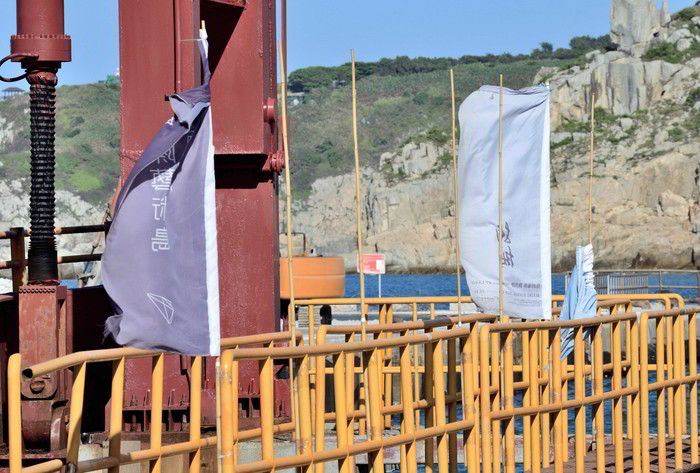 馬祖國際藝術島在東引 幾面宣傳旗幟都管不好 --閱讀人次 : 2564 配合國際藝術島登場,東引中柱港紅橋欄杆懸掛了數面宣傳旗幟,但是掛了以後再也沒有理會,大半個月來,幾面沒有被風吹走的退色旗幟,如同破布一般,一天又一天地在人來人往的港區展示著,難看到不行。