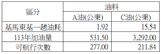 2. 再從113年1至12月的燃油消耗量,對比全港通公司提出台馬交通船油耗比較表,以C油在基馬東基一趟油耗為15.54公秉,全年加油量總計3,292公秉,經計算可航行次數為211航次,A油加C油的燃油費約為8,078萬元。