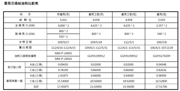 1.新臺馬於民國113年1月28至30日(冬季)及7月17至19日(夏季)由機關指定公證人進行兩次油耗公證,兩次結果取其平均,此結果與其他兩艘臺馬航線客貨船比較如下: