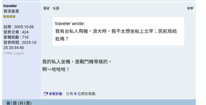 traveler的個人資料 發送私人訊息給traveler  IP位址: Logged