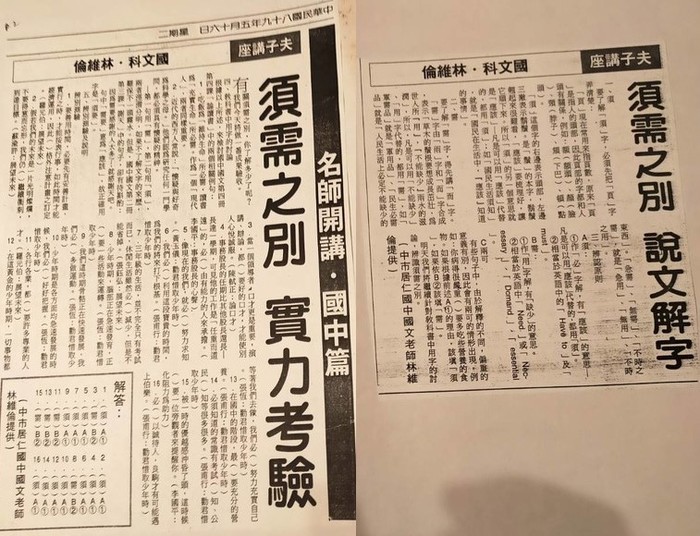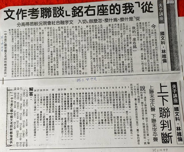 淚眼矇矓中,我想要讓教官知道:當年那沒有被折斷的壓傷蘆葦,那個伶仃受欺的孤貧學生沒有忘記教官,他牢記教官的殷殷囑咐,他站起來了,他憑自己的實力上榜兩所師範,他憑自己的實力上了師大,而且,因為苦讀,他扎下了堅實的基礎,不僅在班上變成各科目請教的對象,還應邀,不,應該說是:還受到中央日報鄭重拜託、在名師開講專欄發表文章,因而請教的函電由四面八方湧入,甚至有學生還在高中圖書館看到他所寫的剪報彙編;台灣省第一屆國中組命題競賽特優是他,第二十四屆中國語文獎章得主還是他!但是,教官,親愛的教官,您都看到了嗎?教官,親愛的教官,您在哪裏?整整六十年過去了,您都在哪裏?您知道有一個孤貧學生一直在想您、一直在學您嗎?您知道他一直也有一路相挺、到現在還互相砥礪的摯友嗎?教官,親愛的教官,您在哪裏?整整六十年過去了,您都在哪裏?教官, 他好想您,好想,好想! 您看看:下面就是當年您的苦心與善心所孕育出來的一些些成果舉例,教官,親愛的教官,您看到了嗎: