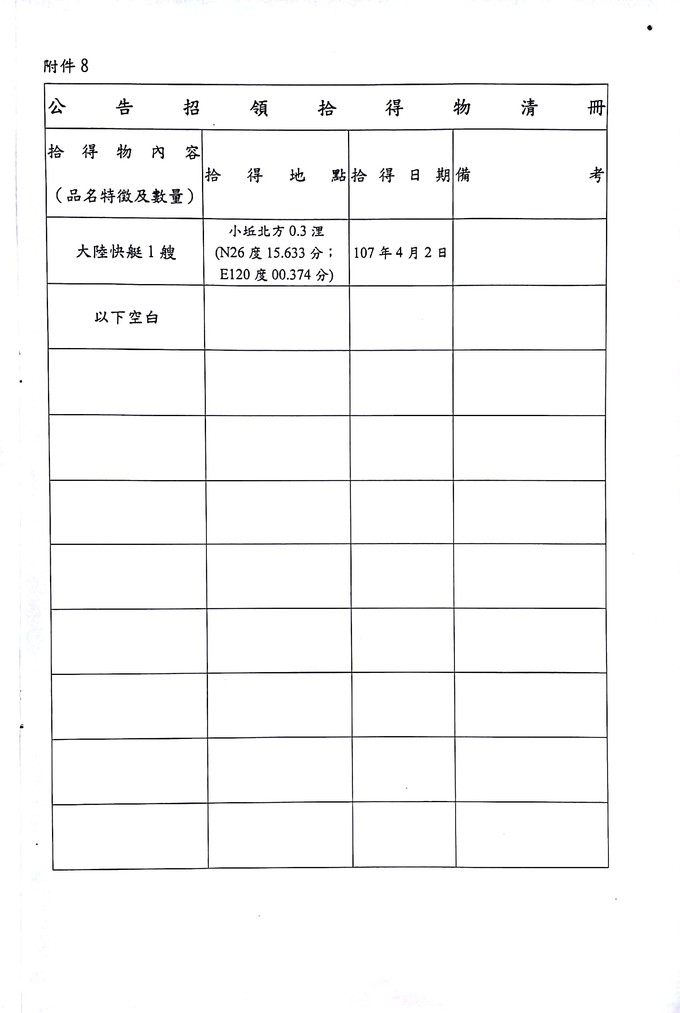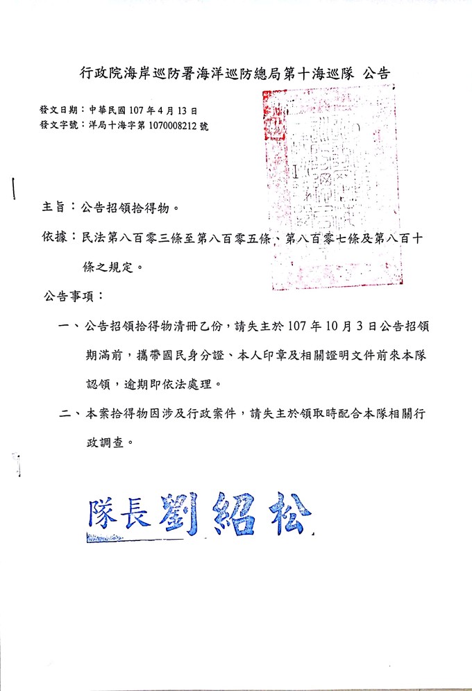 本案因涉及行政案件,請船主於領取時配合本隊相關行政調查。