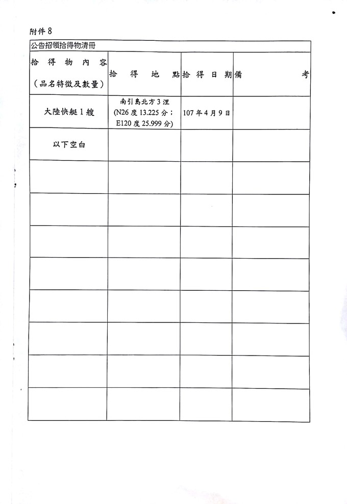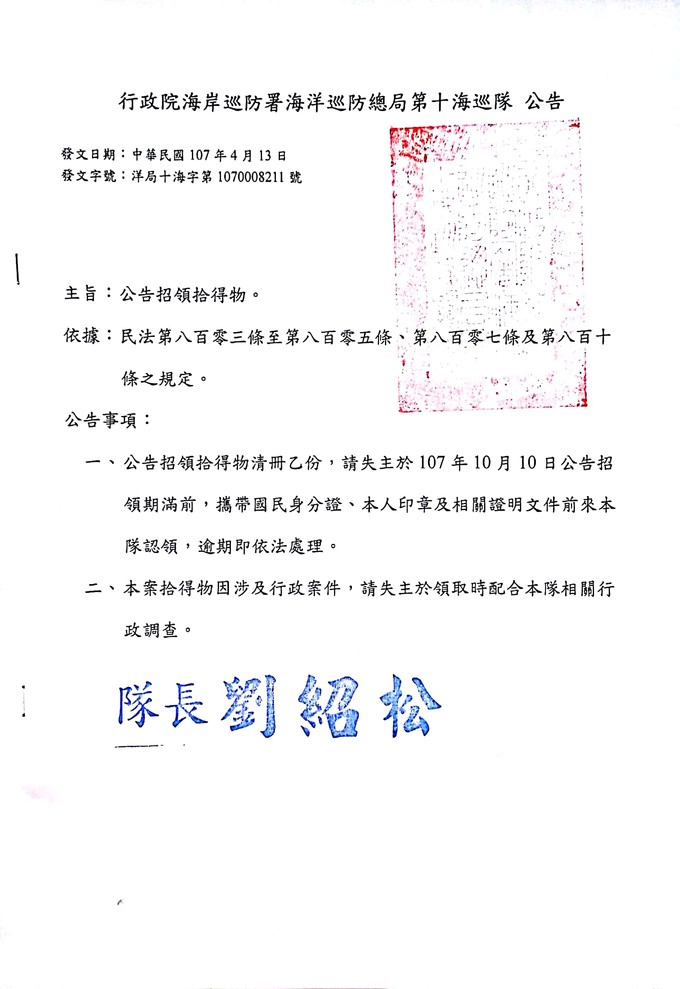 本案因涉及行政案件,請船主於領取時配合本隊相關行政調查。