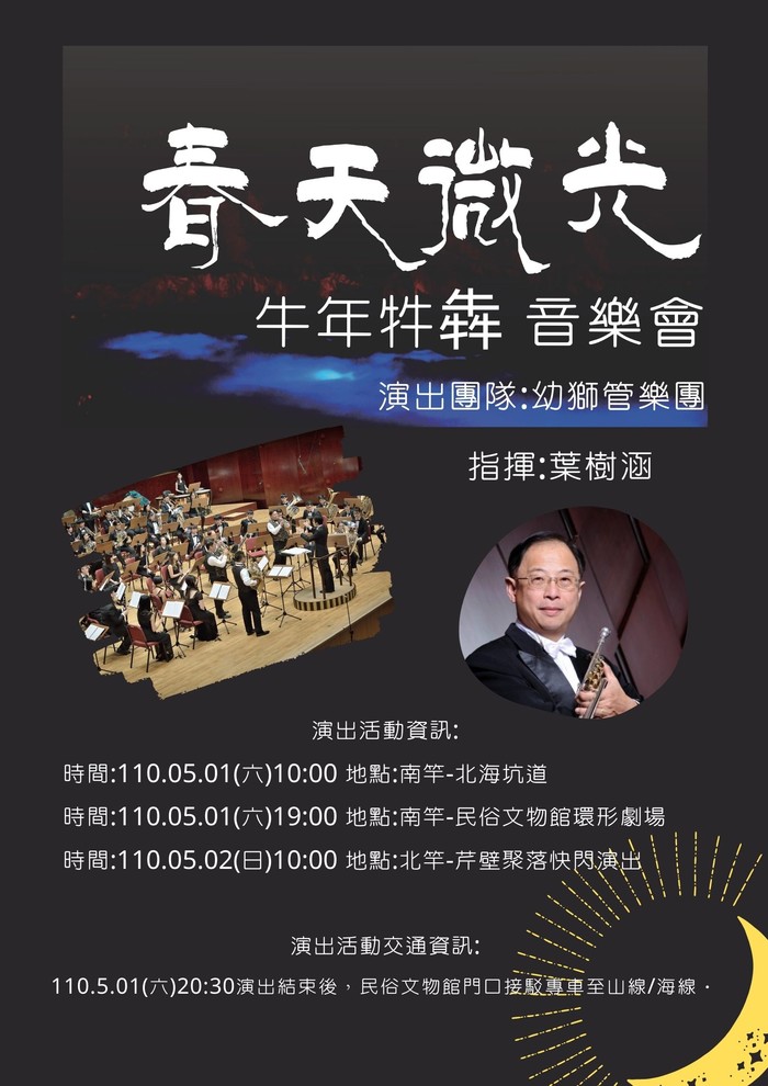 歡迎各位民眾、鄉親共同參與幼獅管樂團演出,時間:5月1日下午19時開始,請提早20分鐘到場,地點:馬祖民俗文物館戶外環形廣場。