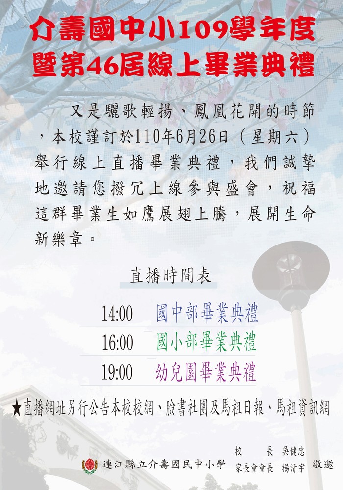 本校因應COVID-19疫情,依教育部規定全國各級學校畢業典禮停辦或改以線上方式辦理。故本校取消原訂6月18日(星期五)假縣立體育館舉辦之109學年度實體畢業典禮,更改至6月26日(星期六)於線上舉行。歡迎大家共襄盛舉,一起上線祝福全體畢業生,畢業快樂、鵬程萬里,並祈願疫情早日平息。