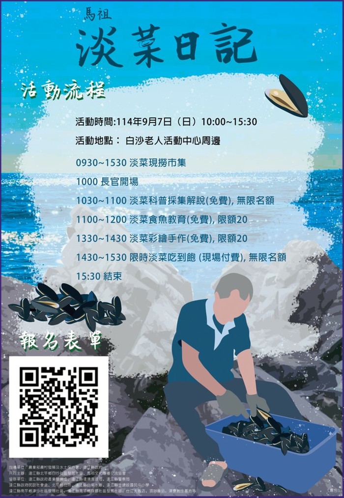 於114年9月7日盛大登場,邀請大家走進連江縣北竿鄉白沙村,一同直擊馬祖淡菜的產地。本活動結合 [淡菜現撈市集、淡菜科普採集、淡菜食魚教育、淡菜彩繪手作],帶領民眾認識淡菜的一生。