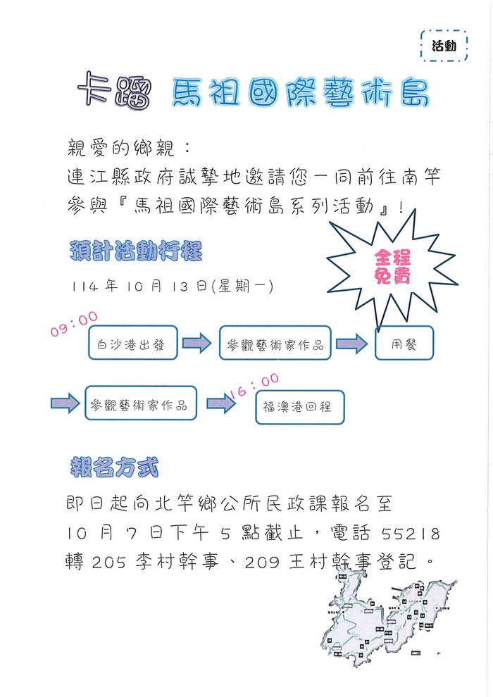 北竿鄉親參加藝術島活動開始報名囉 --閱讀人次 : 881 南竿【參觀藝術家作品、用餐、參觀藝術家作品】--> 16:00【福澳港回程】 報名方式: 即日起向北竿鄉公所民政課報名至10月7日下午5點截止,電話55218轉205李村幹事、209王村幹事登記。 遇例假日報名 電話55218轉200(總機)報名 北竿鄉公所 誠摯邀請