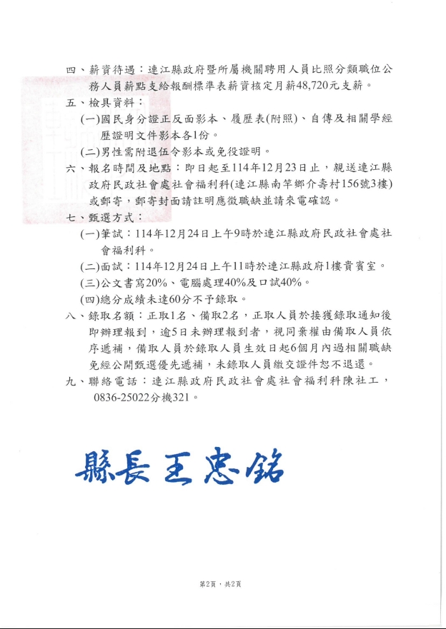本府民政社會處甄選「約聘職代社會工作師」1名。
