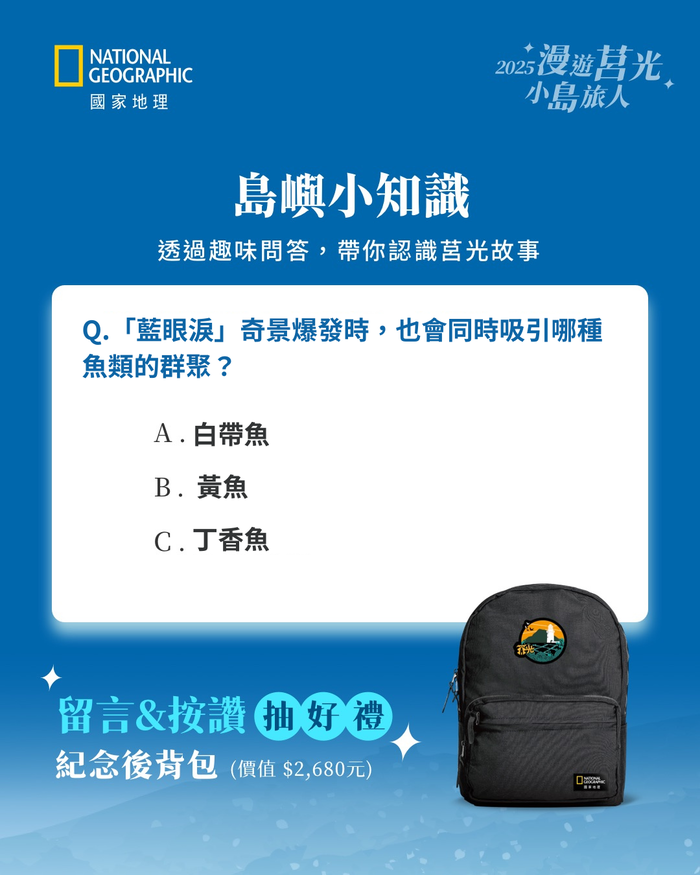 漫遊莒光 島嶼小知識Q9來抽獎! --閱讀人次 : 512 2025 漫遊莒光系列活動「島嶼小知識」Q9熱烈進行中!1/13(二)前至國家地理雜誌 FB 留言,就有機會把好禮帶回家!