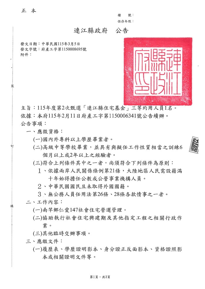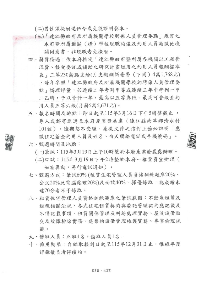 產發處公告住宅基金第2次甄選約用人員