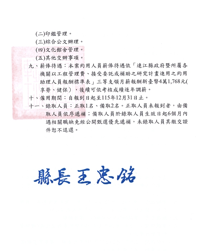 九、薪俸待遇:本案約用人員薪俸待遇依「連江縣政府暨所屬各機關以工程管理費、接受委託或補助之研究計畫進用之約用 助理人員報酬標準表」三等支領月薪報酬新臺幣4萬1,768元(享勞、健保),後續可依考核成績逐年調薪。