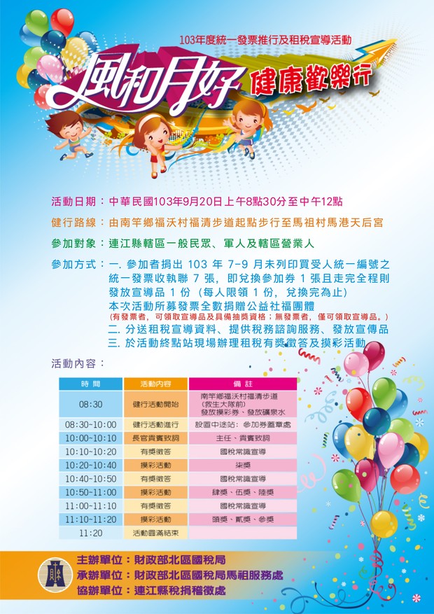 7張發票、抽機票,9/20早上8點在福澳! --閱讀人次 : 2072 「風和月好,健康歡樂行」統一發票推行及租稅宣導活動