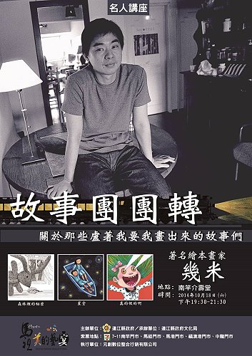 縣府文化局名人講座邀請知名繪本作家幾米,主講「故事團團轉—關於那些盧著我要我畫出來的故事們」,將和大家分享幾米創作天馬行空的繪本故事,講座將在10月18日晚間7時30分於南竿文物館演藝廳舉行,有興趣的民眾可以前往南竿各7-11索票,文化局誠摯邀請大家一同進入幾米充滿想像的繪本世界!