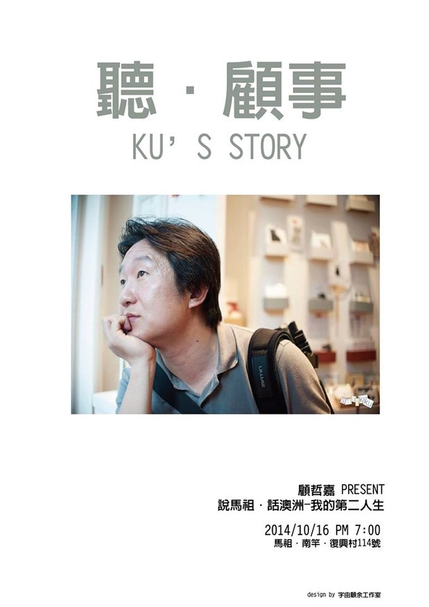 由文化局藝文補助計畫舉辦,10月16日星期四晚上七點在牛角村114號議會秘書劉枝蓮家的海老屋,顧哲嘉將談談他親身經歷並配合他的攝影作品來說故事,以「說馬祖話澳洲」我的第二人生─藝術為主題,鼓勵年輕人如果想要做,就勇敢向前行!有興趣的鄉親請前往聆聽!