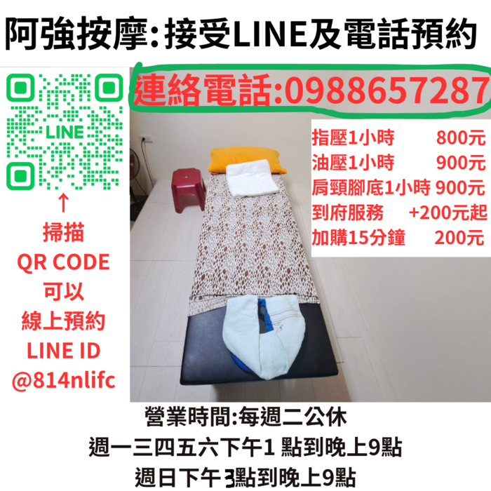自從十二月底手腕扭傷直到本週參加完爺爺追思會後阿強按摩從1/22日起恢復精油按摩及腳底按摩,歡迎有需要的客人可以預約~!