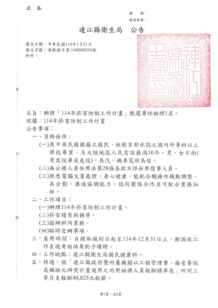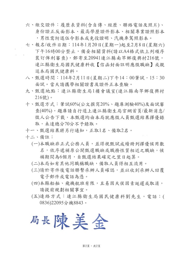 甄試:2月11日(二)下午14:00筆試、下午15:30面試(衛生局1樓會議室)