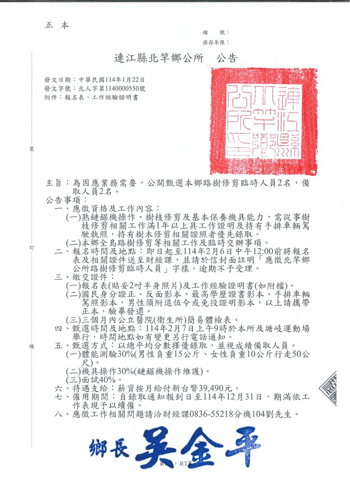 北竿鄉公所甄選路樹修剪臨時人員2名