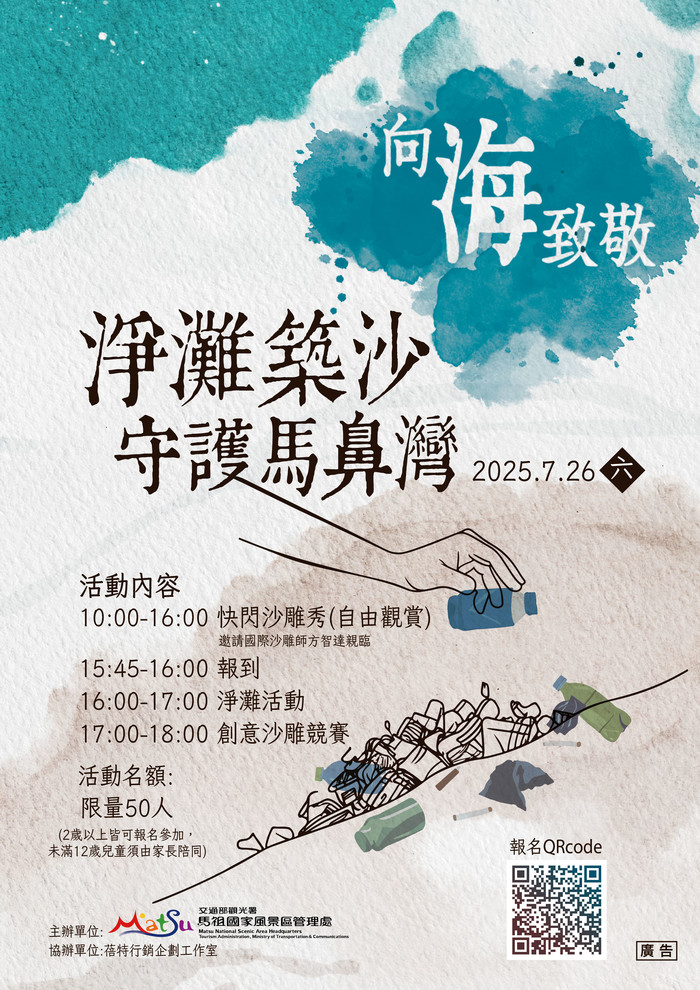 為喚起海洋保育意識,馬管處邀您一同參與結合「淨灘行動」與「沙雕藝術」的環保體驗。邀請國際沙雕藝術家方智達老師現場創作快閃沙雕,並親自帶領沙雕體驗競賽,鼓勵使用淨灘資源發揮創意—讓「垃圾也能成為藝術」!