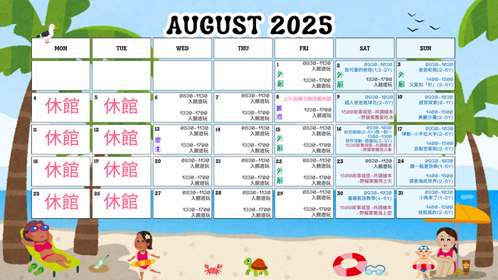 八月份的行事曆,包含自由探索入館以及各種課程。
