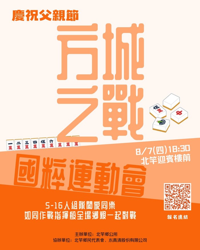 北竿鄉『方城之戰:國粹運動會』活動 --閱讀人次 : 768 一、起源:一年一度父親節即將到來,本所邀請水青清有限公司設計「方城之戰:國粹運動會」活動,不僅讓鄉親在歡樂的氛圍中體驗傳統麻將文化的魅力,更藉由趣味搬運挑戰,激發團隊合作與策略思考能力,並同時串連「星漩七夕:北竿海洋音樂會」及「北竿酒季」一系列活動,激發參與者的熱情與凝聚力,營造一個溫馨、充滿趣味與文化意義的節慶盛事,讓大家在歡笑與競技中,共同慶祝這個特別的日子。