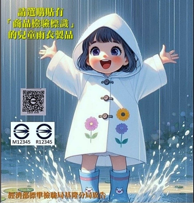 1. 選購兒童雨衣時應挑選經標準檢驗局檢驗合格之產品,品質方有保障,檢驗合格之商品上應有「商品檢驗標識」,圖例如相關照片。