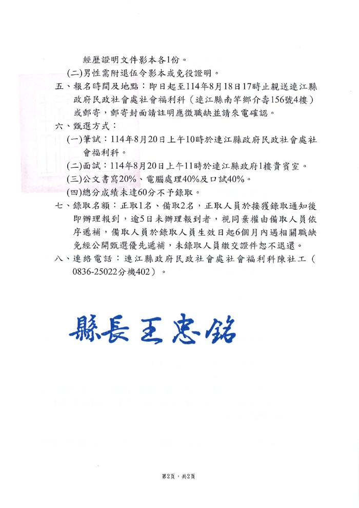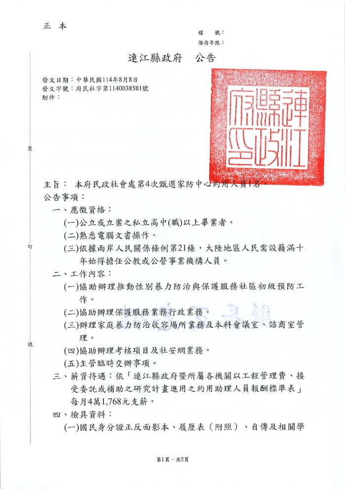 民政社會處徵選家防中心約用人員1名