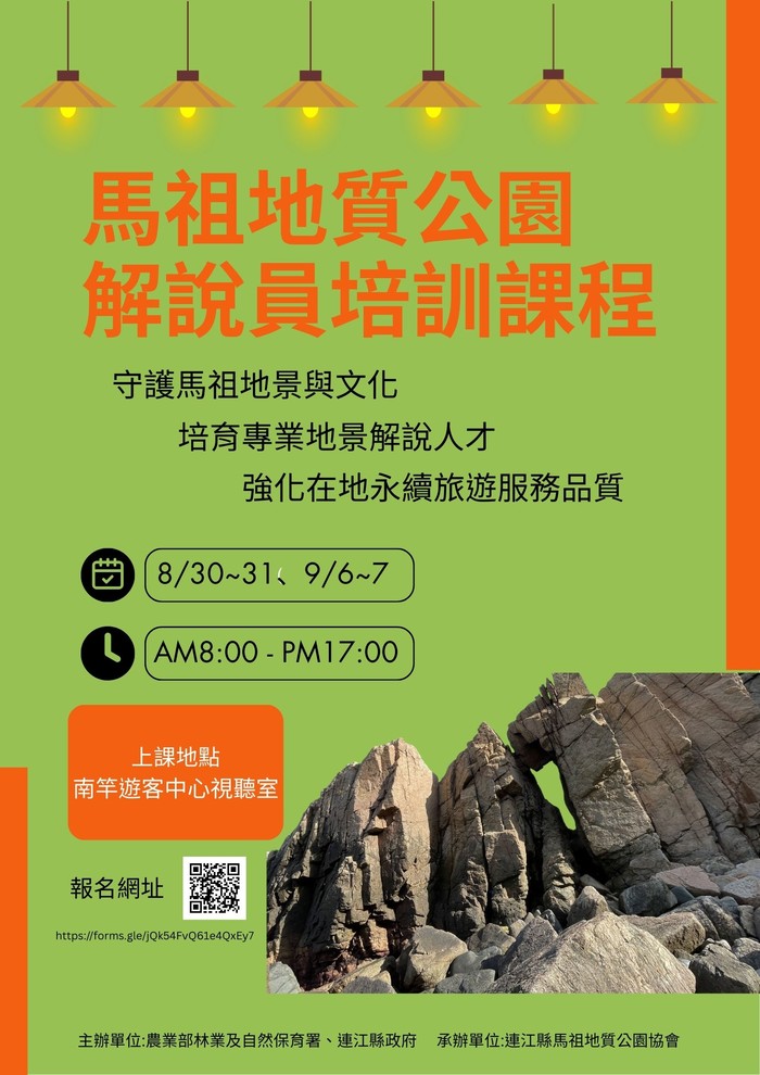 為推廣地質公園理念、提升地景解說品質,並強化地區導覽與永續旅遊人力,連江縣政府主辦、馬祖地質公園協會承辦,將舉辦 「馬祖地質公園解說員培訓課程」。