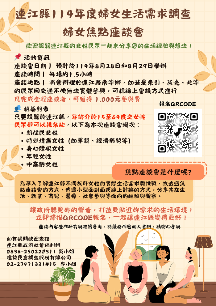 【限額招募】× 連江縣婦女焦點座談會 --閱讀人次 : 885 💖 【限額招募】連江縣婦女焦點座談會 💖