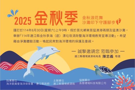 114年金秋季淨灘護海,落實綠色生活! --閱讀人次 : 480 連江縣環境資源局將於8/30(六)09:00在東莒猛澳港碼頭候船室前廣場、東莒猛澳沙灘舉辦[114年金秋季-海漂垃圾清除暨海洋環境教育活動],以實際的行動來守護海洋環境。