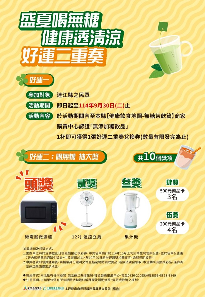 🎟 民眾凡至合作店家購買認證「無添加糖飲品」,即可獲得「好運二重奏兌換券」(數量有限發完為止),並有機會參加抽獎,另外還有神秘小活動,隱藏於活動店家中,完成就有機會抽「營養帶著走-麻布袋」。