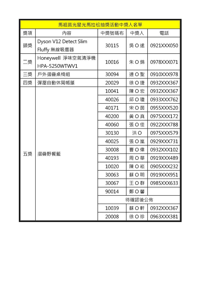 中獎獎品刻安排船運自馬祖莒光送回台灣,大會收訖後將分別寄予中獎人;另因天氣及船運排程影響,預期寄送將有所延誤,請選手耐心等候。