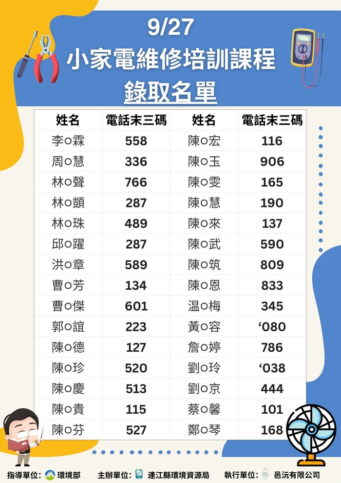 9/27小家電維修知識培訓【錄取公告】 --閱讀人次 : 773 為延續物命、減少資源浪費,並提升馬祖地區家電自主維修能量,連江縣環資局自114年起推動「小家電維修系列培訓課程」,由專業技職團隊授課,透過實作演練與鄉親參與,培養在地維修志工,逐步建構「不用品維修站」,實踐修繕共享與愛物惜物的精神。