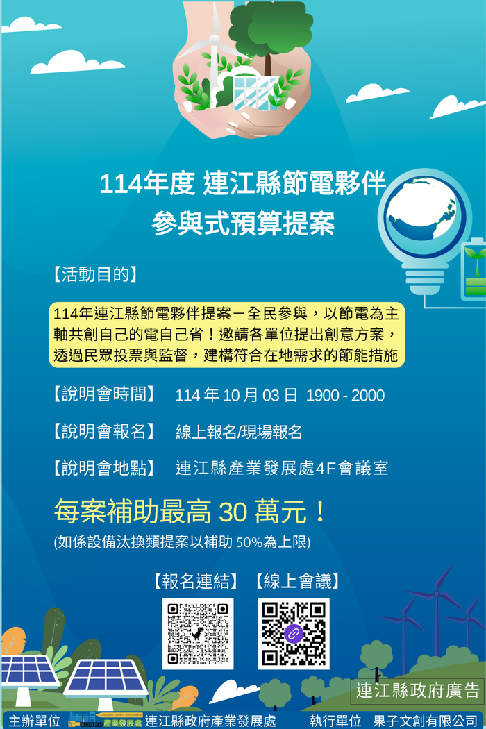 為推動全民共同參與公共事務,並鼓勵縣民提出在地化的節能方案,縣府產業發展處將於10月3日(五)舉辦「114年節電夥伴參與式預算提案」說明會,獲選的提案每案最高可獲得新臺幣30萬元補助,總獎勵金額高達90萬元,鼓勵在地團隊發揮創意,為馬祖打造更節能、環保的居住環境。