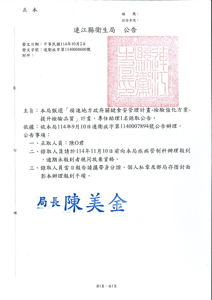 衛生局「精進地方政府關鍵食安管理計畫」專任助理1名錄取公告