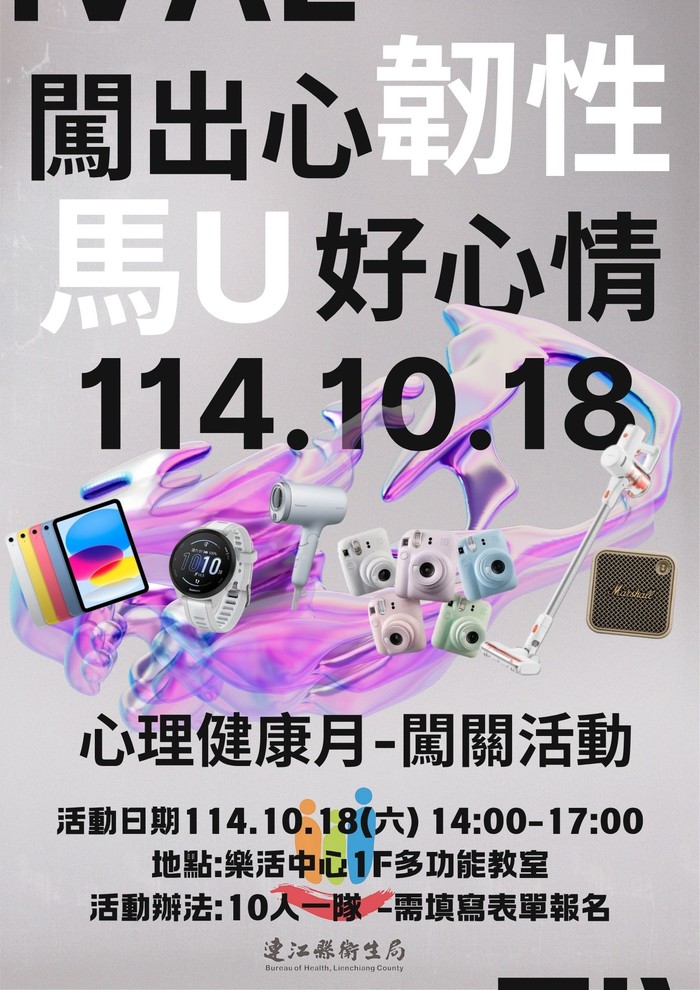 為響應2025世界心理健康日「災難、逆境下的心理健康與韌性」主題,特別舉辦趣味闖關活動,透過團隊互動遊戲,一起放鬆玩,打造好心情!還有豐富的獎品等你來帶回家!趕緊呼朋引伴來參加~