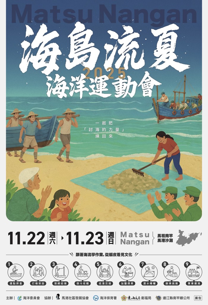 此次海洋運動會結合馬祖傳統漁法「拍楸佈網」的技藝,在南竿馬港沙灘搭建情境式關卡,把蝦皮流程轉譯為全民參與的運動挑戰與合作任務,讓長者、青壯年、孩童與阿兵哥共同參與一場重現馬祖漁業榮景的海洋運動會。並結合四場講座(漁業歷史、海洋氣象、海洋教育、運動保健)從各面向各了解馬祖蝦皮作業的歷史與知識技能。