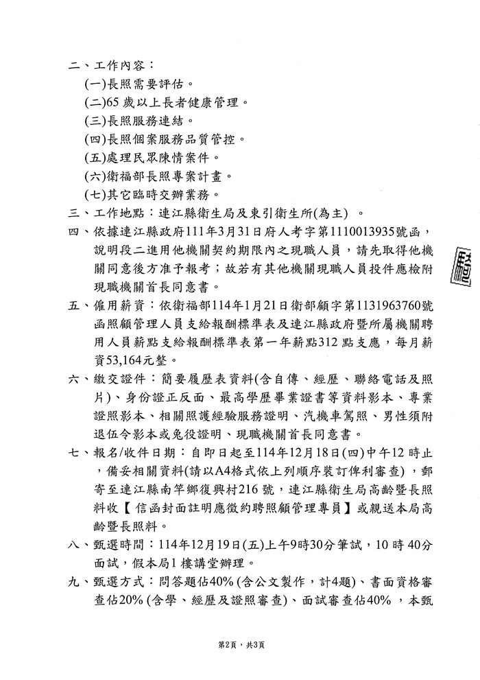 衛生局徵選長照3.0計畫聘用照管專員1名