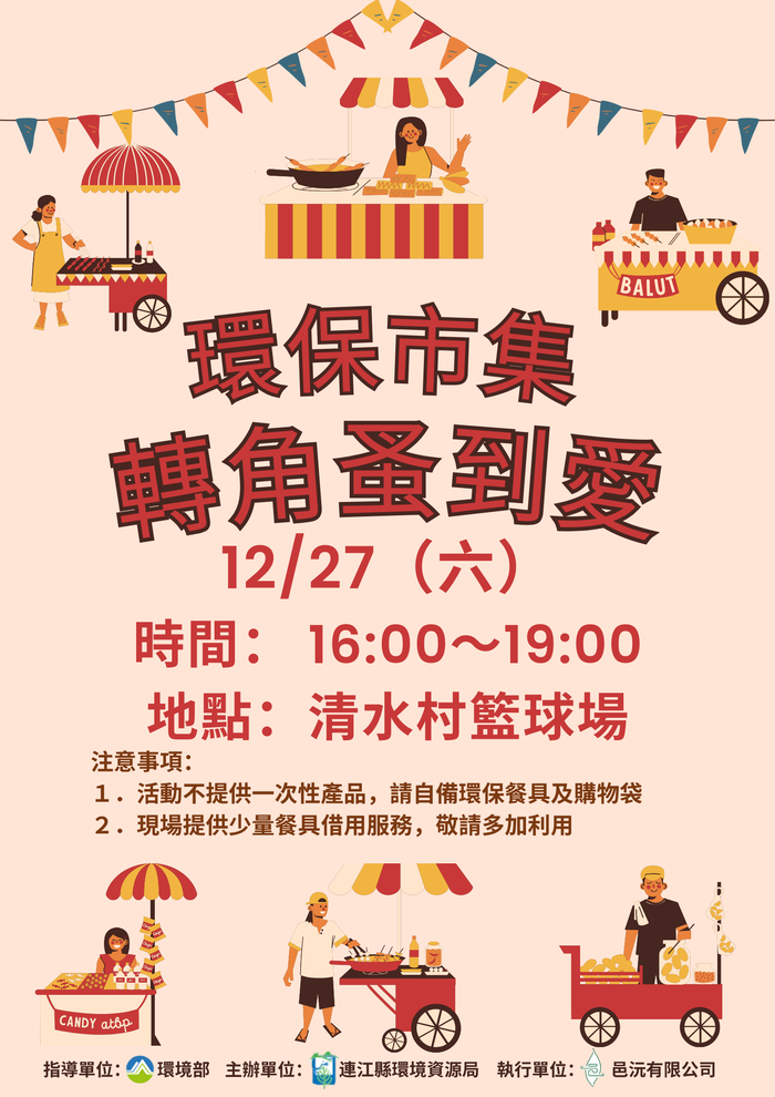 連江縣環境資源局將於 12月27日(星期六)下午4點至7點,在 清水籃球場 舉辦一場充滿綠意的 環保市集!
