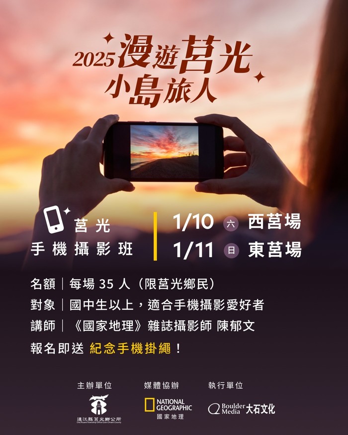 【免費】國家地理莒光手機攝影班即將額滿 --閱讀人次 : 748 「2025漫遊莒光 小島旅人」由馬祖莒光鄉公所攜手《國家地理》雜誌,共同推出系列活動「莒光手機攝影班」,邀請你用手機記錄下莒光。在熟悉的島嶼日常中,藏著最動人的風景,本次邀請《國家地理》雜誌攝影師——陳郁文老師 親自授課,帶領莒光鄉民從構圖、光線到拍攝實作,學習如何運用手機,拍出屬於自己的島嶼故事,讓日常影像成為值得保存的風景。