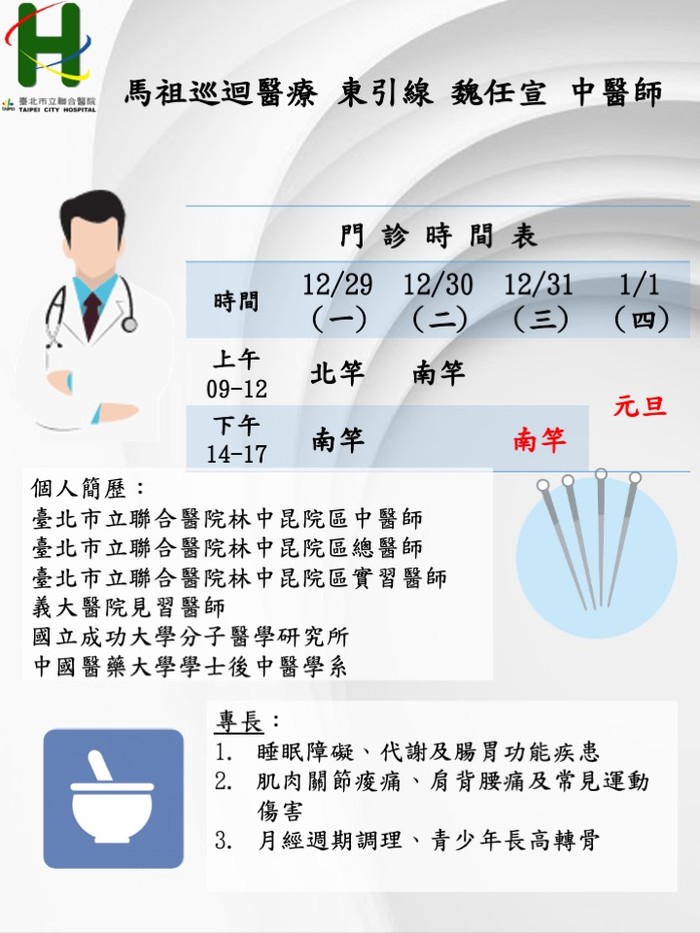 馬祖中醫巡迴醫療114/12/29-115/1/1由莒光線 戴毓萱醫師、東引線魏任宣醫師前往支援服務。