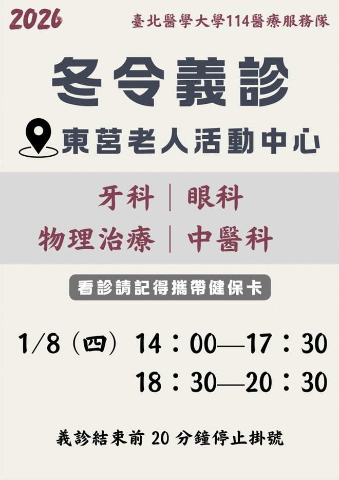 有來自台北醫學大學所舉辦之義診服務,看診科別包括眼科、牙科、中醫科、物治科,由專業醫師為鄉親看診,歡迎有需要的民眾前往活動中心,並請記得攜帶證件。