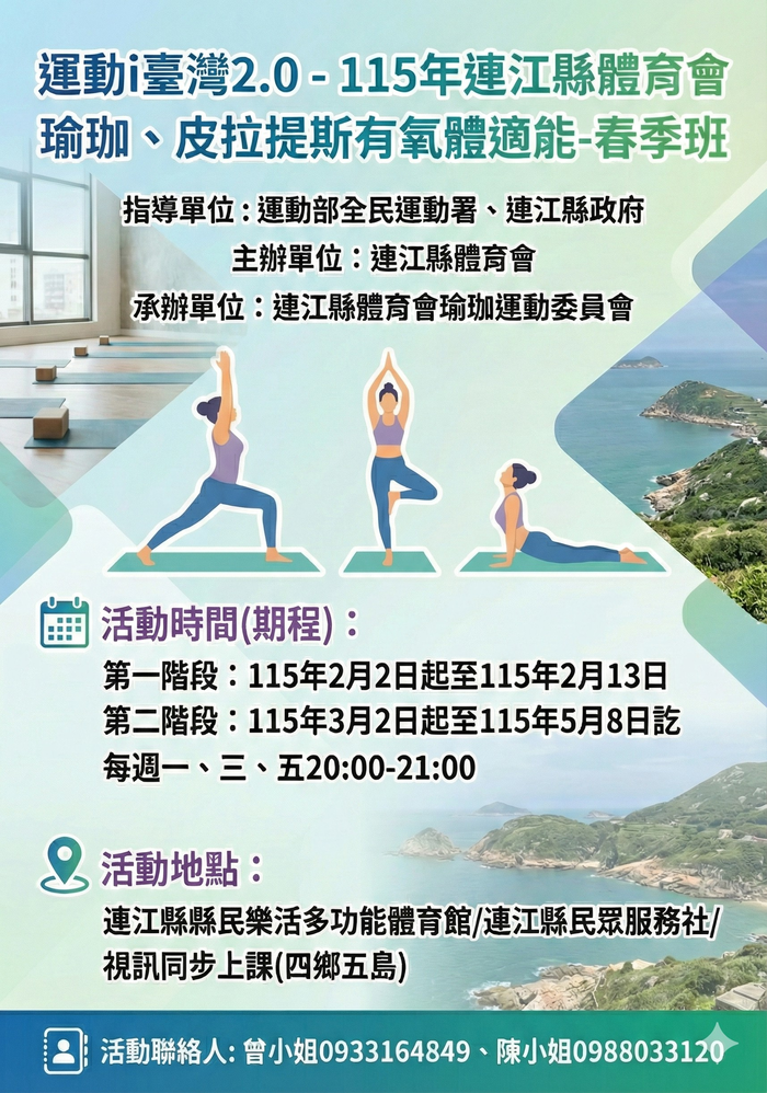 瑜珈、皮拉提斯有氧體適能-春季班 --閱讀人次 : 942 運動i臺灣2.0 115年連江縣體育會瑜珈、皮拉提斯有氧體適能【春季班】開課囉~